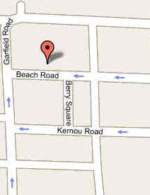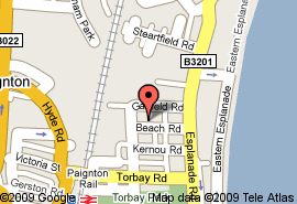 At the end of Cecil Road is a T Junction and set of traffic lights. Turn right and follow the road round to your left in to Paignton town centre. Take the next sharp left over a level rail crossing and continue to the sea front with the cinema in front of you. Turn left and when you pass the “Spinning Wheel” pub take the next left in to “Beach Road”. We are at the top of the road.