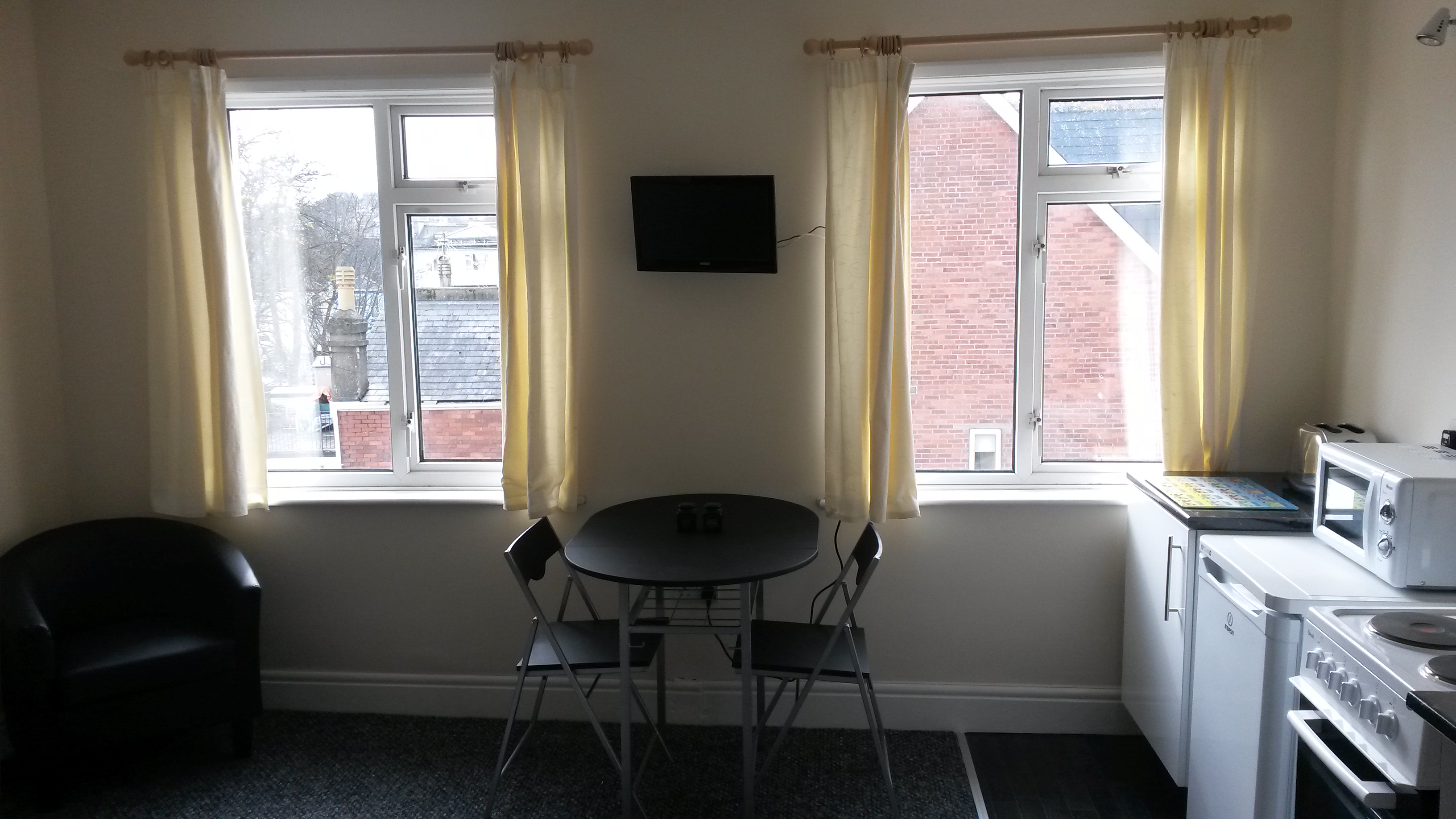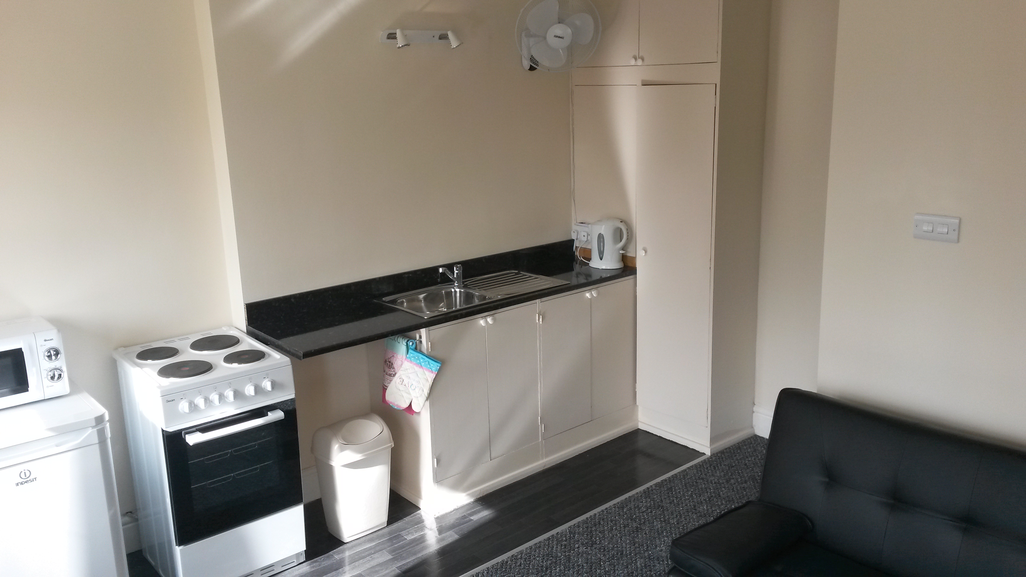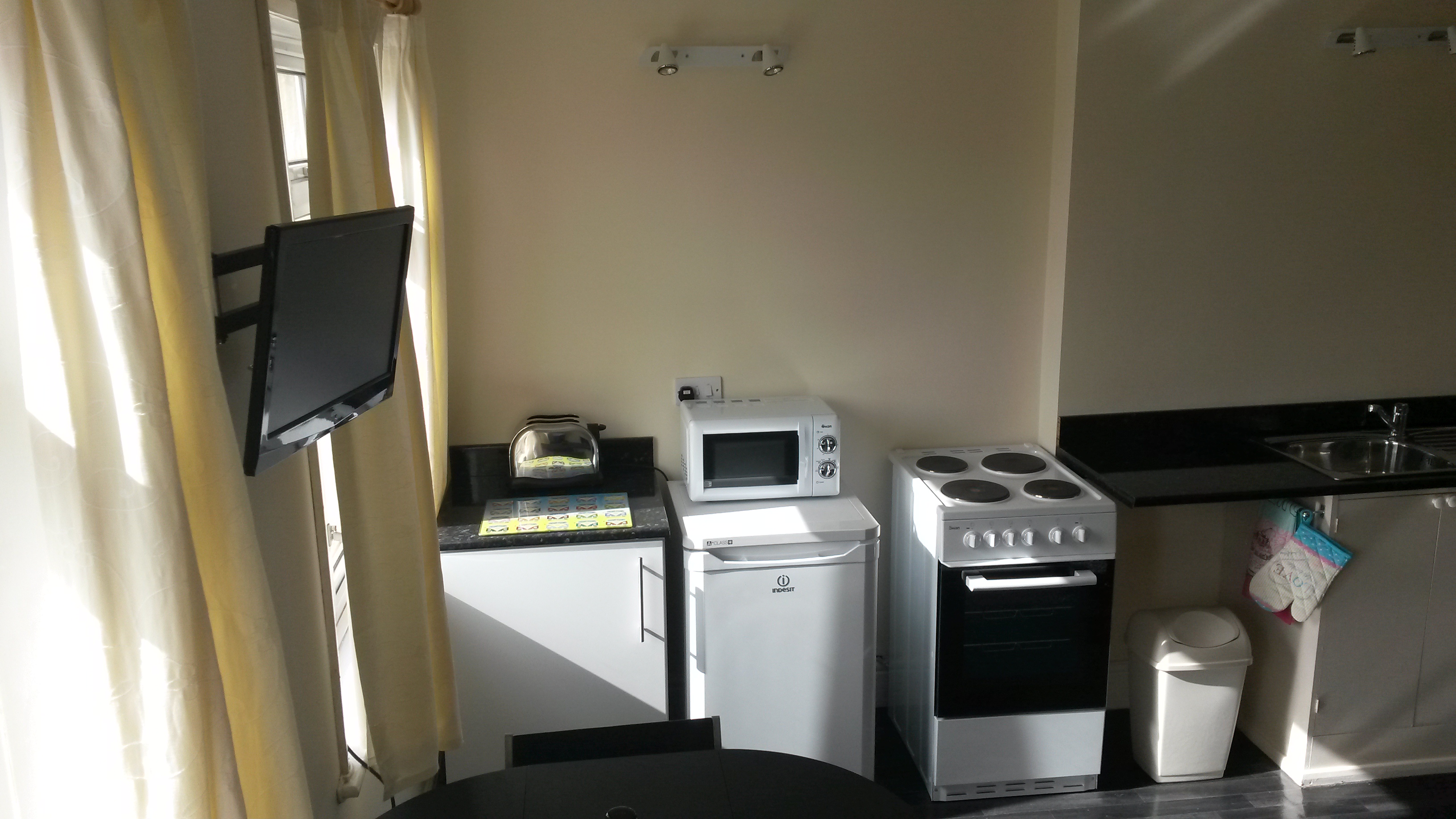 Our self catering flat is situated on the second floor and comprises open plan lounge /kitchenette and separate bedroom with en-suite shower and w.c. It is all electric and guests pay for this with a separate meter which takes £1 or £2 coins.